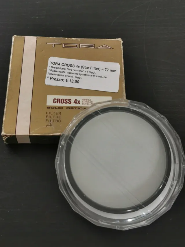Dettagli del prodottoFiltro Tora Cross 4x (Star Filter) da 77 mm. Trasforma i punti luce in croci.