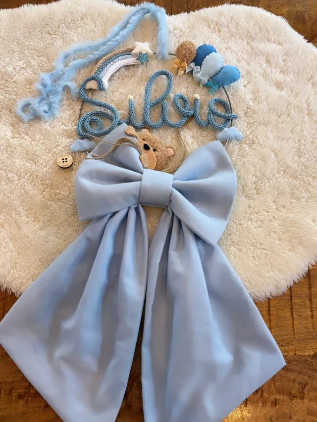 Dettagli del prodottoFiocco nascita azzurro, perfetto per accogliere un nuovo arrivo. Realizzato a mano con cura.