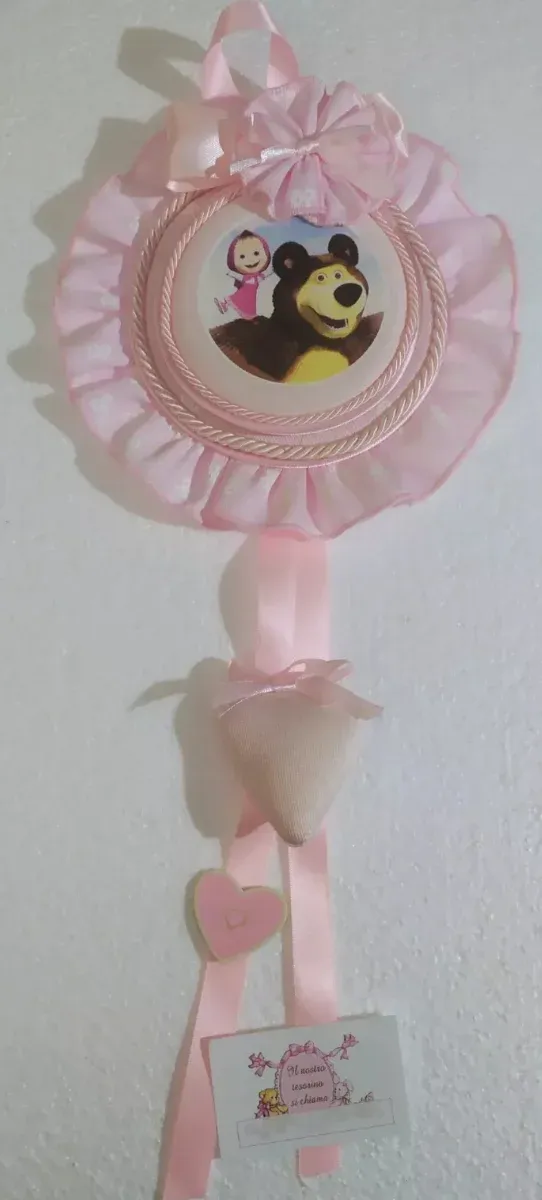 Dettagli del prodottoFiocco nascita personalizzato con i personaggi di Masha e Orso.
