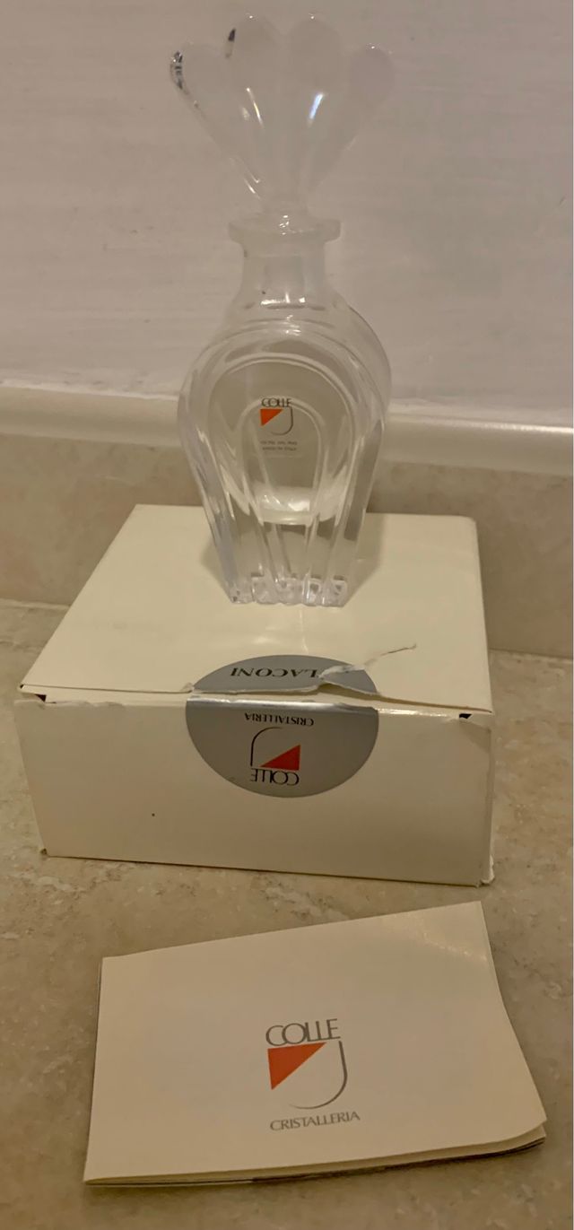 Dettagli del prodottoFlacone con tappo in cristallo oltre 24% di piombo della cristalleria colle. Nuovo in confezione originale con bollino del produttore , pregiata manifattura. Altezza con tappo 11 cm circa.