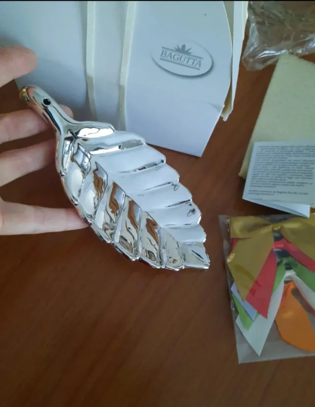 Dettagli del prodottoElegante foglia decorativa della serie "Foglie" di Bagutta, finitura simil-argento. È la foglia di alloro, con nastri-fiocchetti multicolori intercambiabili. Nuova con scatola-fiocco originale e certificato di garanzia. La scatola ha un piccolo strappo (vedi foto). Misure foglia cm 18,5 x 8