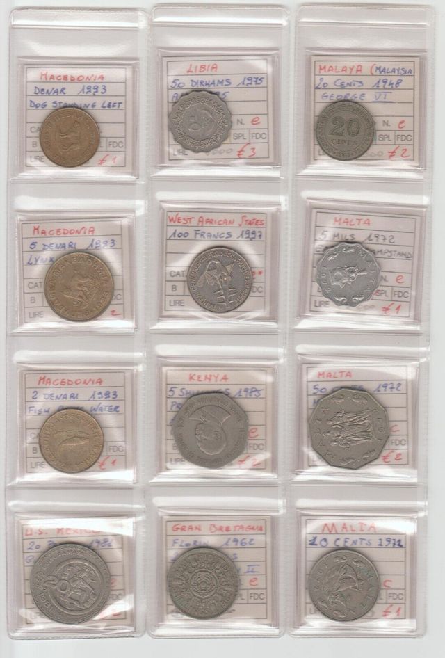 Foglio 12 monete Mondiali,Libia,Macedonia,Kenya,Mexico,ecc. Come da foto le stesse che riceverete.