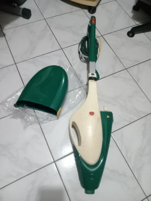 Aspirapolvere Folletto VK 136, un classico per la pulizia della casa. - Colore principale bianco e verde. - Design ergonomico.