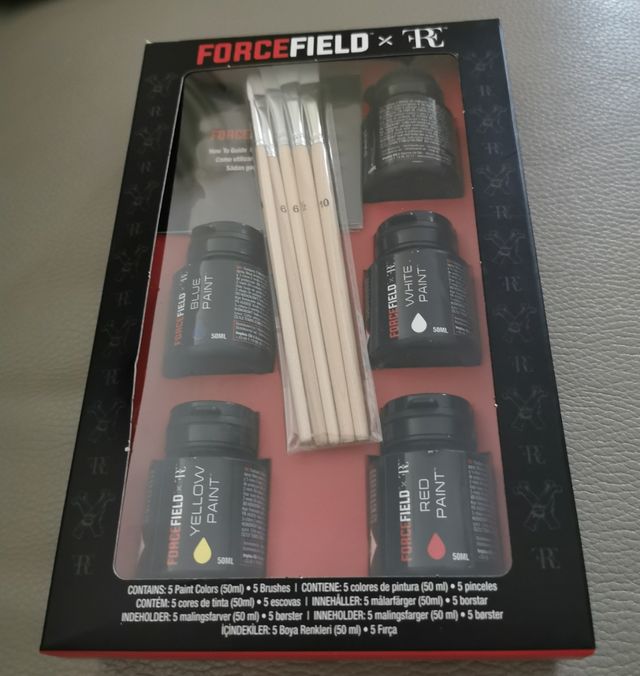 Dettagli del prodottoKit di pittura Forcefield per personalizzare scarpe e altri oggetti. Include 5 colori base e 5 pennelli.
