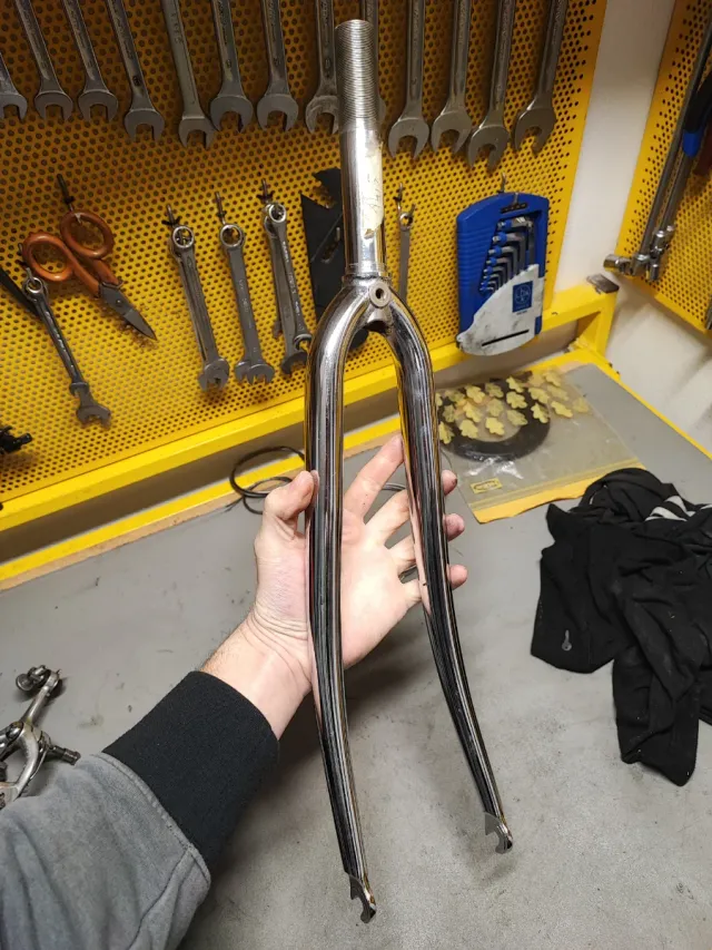 Forcella per bicicletta in acciaio con attacco filettato da 1". Con forcellini Columbus Canotto tagliato a 14.5cm Mai utilizzata Fondo di magazzino