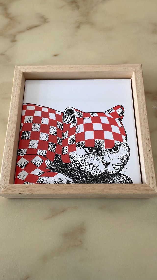 20 x 20 cm piastrella Fornasettiana soggetto Gatto di Piero Fornasetti x ceramiche Bardelli milano in cornice a cassonetto naturale 23,5 x 23,5 cm