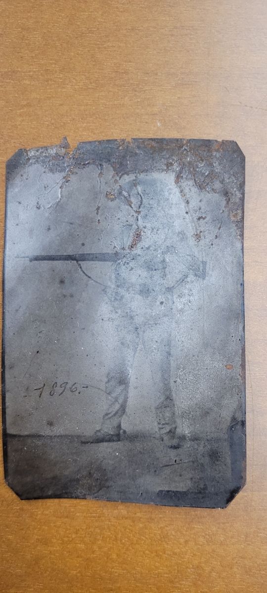 Dettagli del prodottoVecchia foto su lastra di metallo di quello che sembra un soldato spagnolo che indossa un'uniforme e un fucile Rayadillo. Guerra a Cuba.