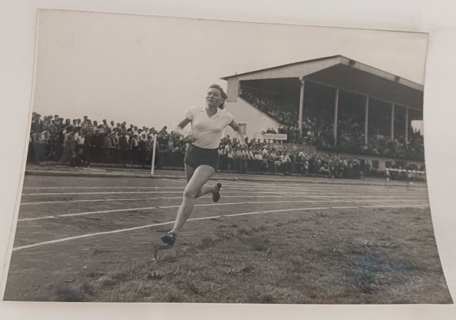 Fotografia originale dell'atleta Bedriska Müllerova in azione. Campionessa 400 e 800 mt - Anno: 1954 - Evento sportivo in stadio con pubblico.