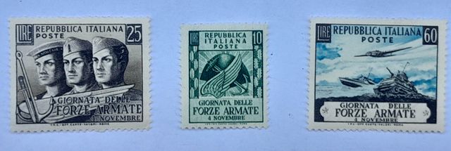 Dettagli del prodottoLotto di tre francobolli della Repubblica Italiana del 1952, dedicati alla Giornata delle Forze Armate. Serie completa, nuovi non linguellati, ottima gommatura, ben centrati