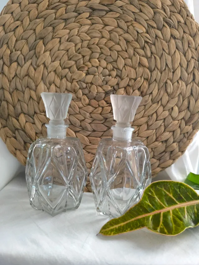 Dettagli del prodottoSet di due antiche bottiglie di profumo francesi in vetro intagliato con tappi satinati della fragranza Midinette del marchio Monarda.