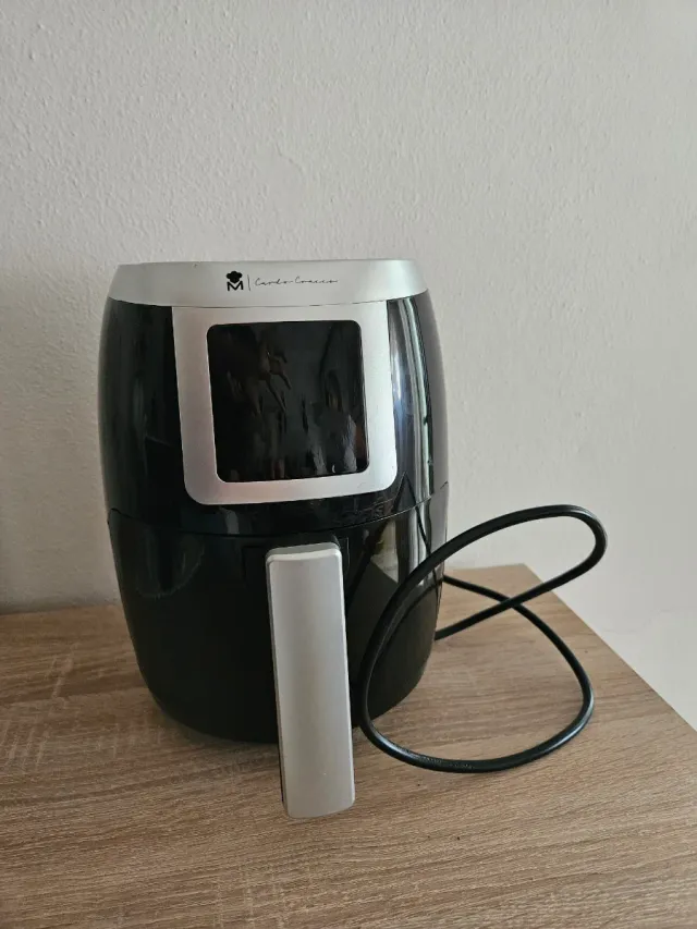 Friggitrice ad aria calda di colore nero con finiture argentate. - Design moderno e compatto. - Manico argentato per estrarre il cestello. - Cavo di alimentazione nero.