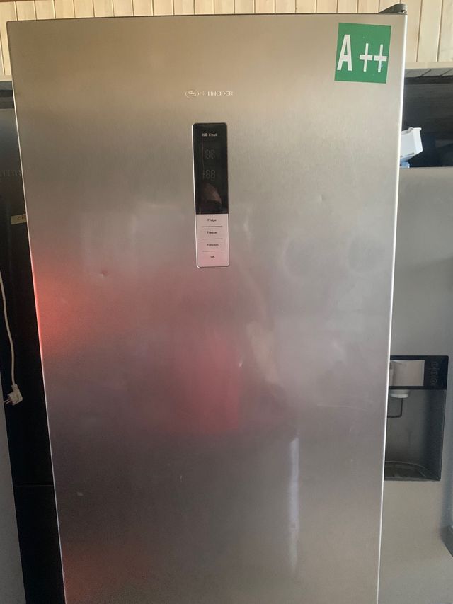 Dettagli del prodottoFrigorifero verticale Schneider in colore argento con classe energetica A++.
