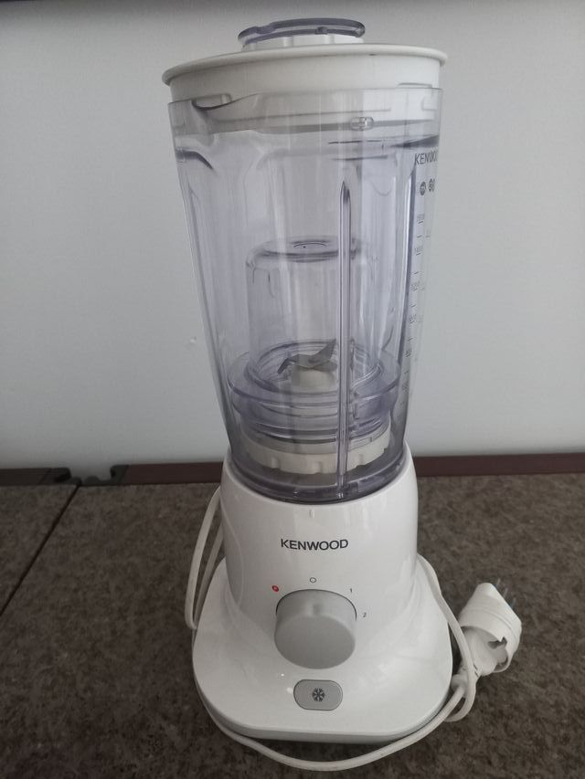 Frullatore Kenwood modello BL470, bianco e trasparente. - Bicchiere in plastica trasparente. - Base motore bianca. - Coperchio con tappo dosatore.