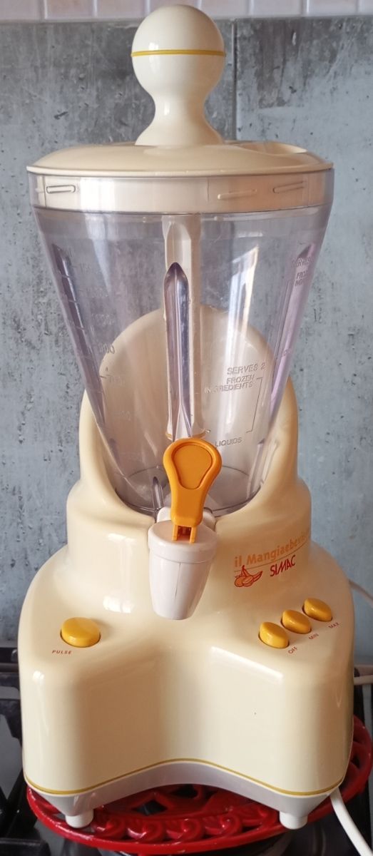 Frullatore Simac per preparare bevande fresche e frullati. - Colore avorio. - Tappo dosatore arancione. - Pulsanti PULSE, OFF, MIN, MAX.