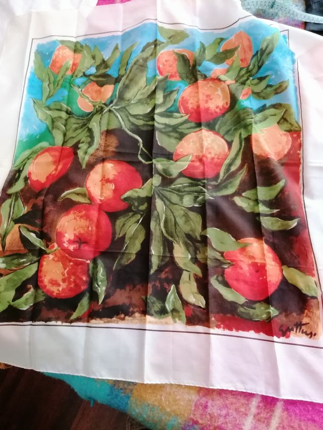 Fular, bordo bianco e disegni di frutta all interno. Cm 88 x 84