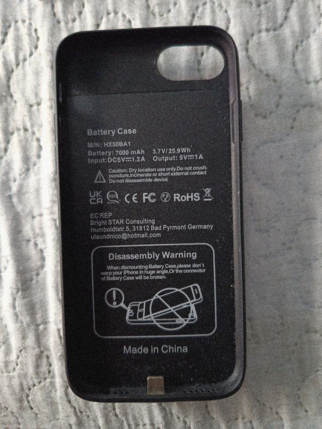 Dettagli del prodottoCustodia batteria nera per iPhone 6, 6s, 7, 8, SE2 e SE3. È in buone condizioni. -batteria 7000 - Capacità: 3.7V / 25.9Wh - Ingresso: DC5.0V=1.2A - Uscita: 5V==1A - Marca: HXS08A1 La descrizione è stata tradotta automaticamente.