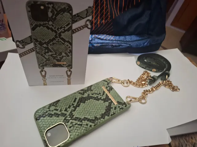 Dettagli del prodottoCustodia elegante con design serpente in toni verdi per iPhone 11 Pro, XS o X. Include catena dorata e cinturino. Design Khaki Python. Compatibile con iPhone 11 Pro, XS e X. Catena e cinturino rimovibili. La descrizione è stata tradotta automaticamente.