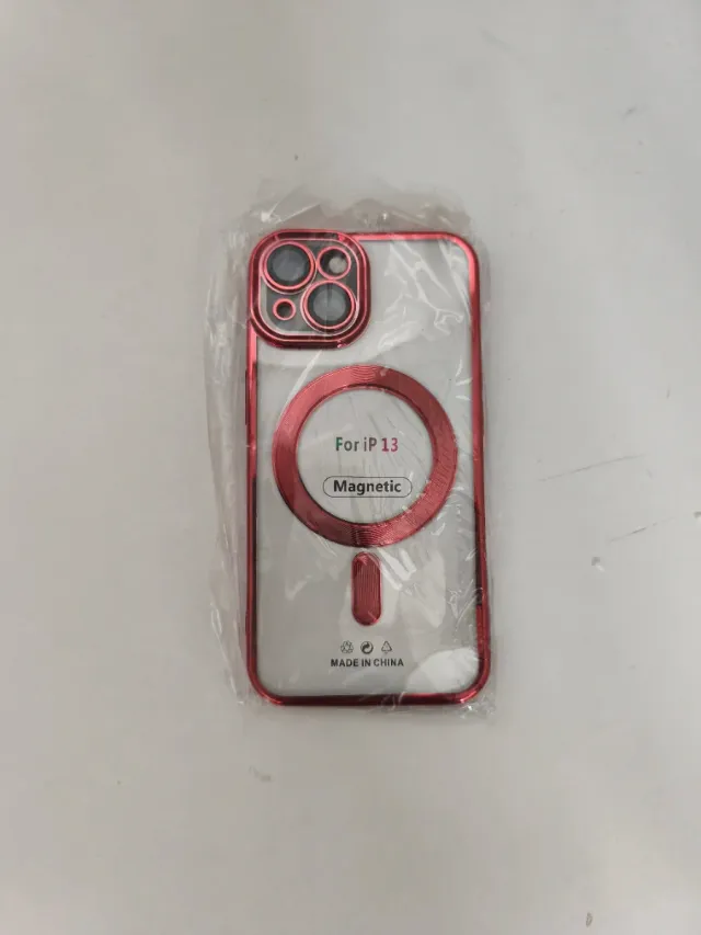 Dettagli del prodottoCustodia protettiva per iPhone 13 con design magnetico. - Bordo metallico rosso. - Parte posteriore trasparente. - Compatibile con la ricarica magnetica. La descrizione è stata tradotta automaticamente.