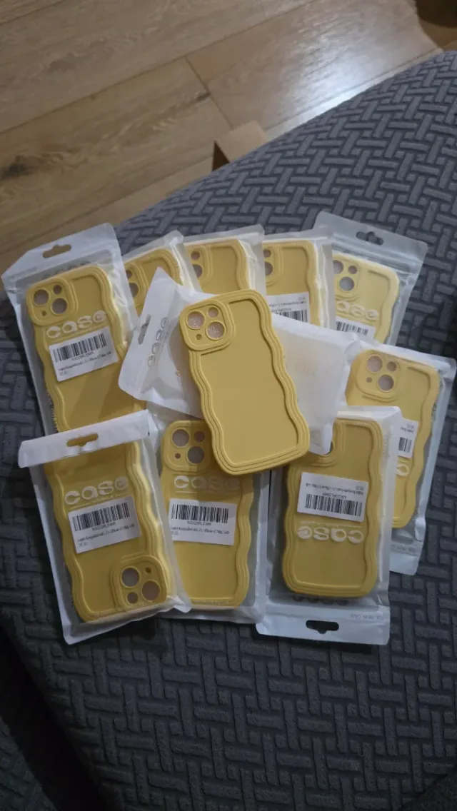 Dettagli del prodottoCustodia protettiva per iPhone in colore giallo con un design ondulato. - Materiale flessibile. - Design moderno e accattivante. - Ci sono 10 unità a 2€ ciascuna, se le prendono tutte il prezzo è 1€. La descrizione è stata tradotta automaticamente.