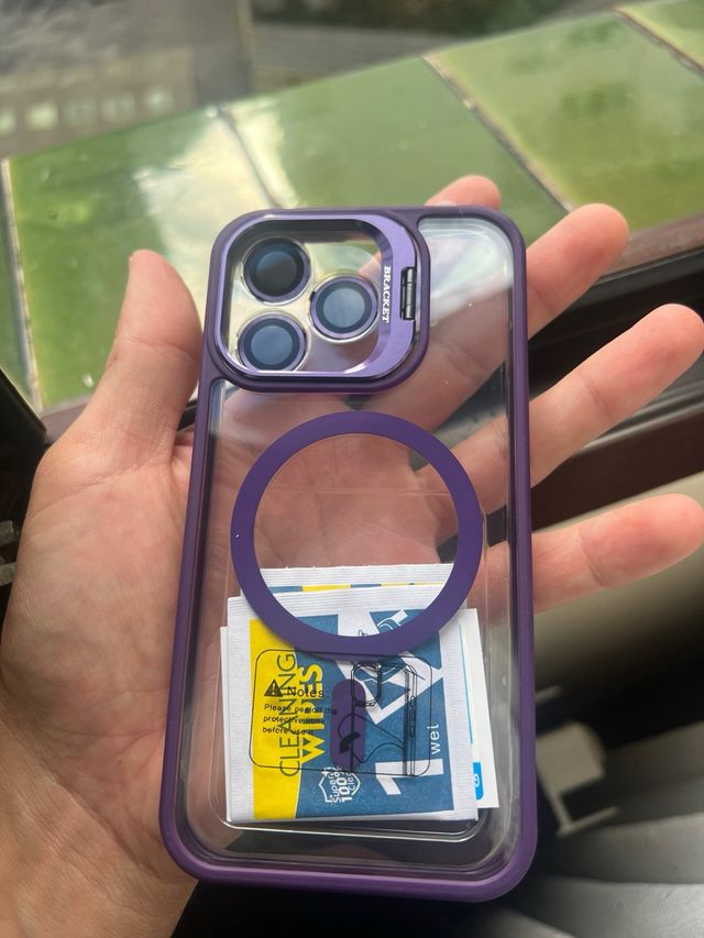 Custodia per iPhone 13 Pro con staffa viola trasparente