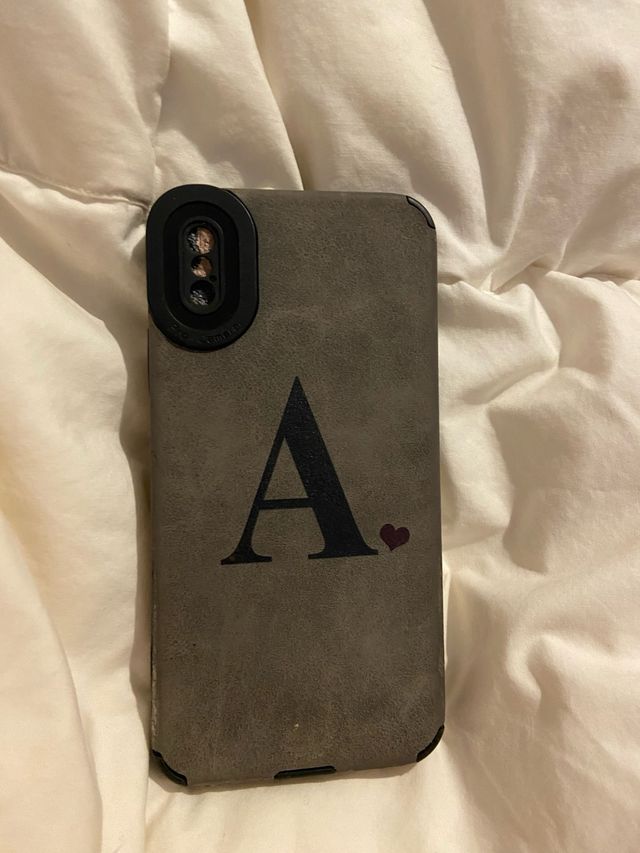 Dettagli del prodottoCustodia protettiva per iPhone XS con un design elegante. Colore grigio con lettera 'A' in nero. Piccolo dettaglio a cuore in bordeaux. Materiale con finitura simile al cuoio. La descrizione è stata tradotta automaticamente.