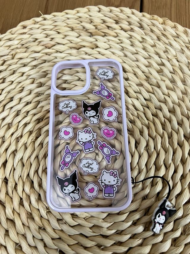 Dettagli del prodottoCustodia protettiva trasparente con design di Kuromi e Hello Kitty per iPhone 13. Include un charm. - Design con personaggi Sanrio. - Bordi viola. - Charm di Kuromi incluso. La descrizione è stata tradotta automaticamente.