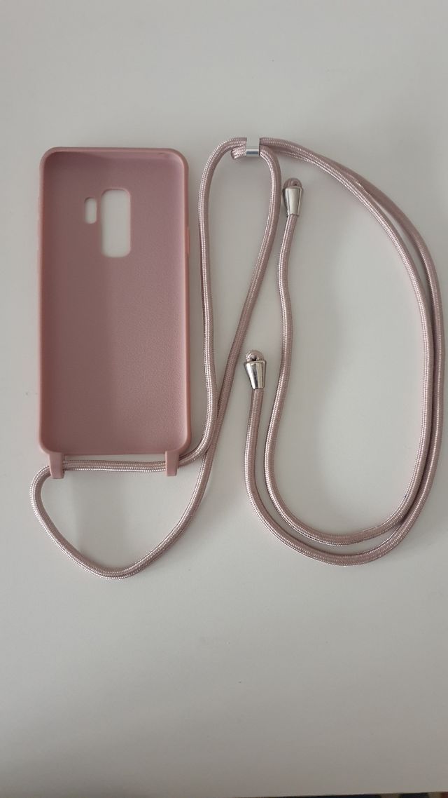 Custodia con cavo compatibile con Samsung Galaxy S9 Plus. Tracolla, catena, cordoncino in silicone morbido. Rosa.