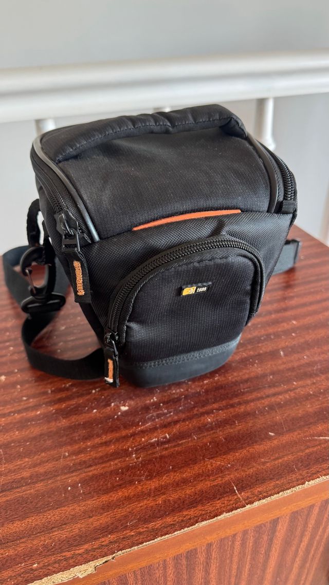 Dettagli del prodottoCustodia protettiva per fotocamera reflex. - Colore nero. - Scomparto principale imbottito. - Tasca frontale con cerniera. - Cinturino regolabile. La descrizione è stata tradotta automaticamente.