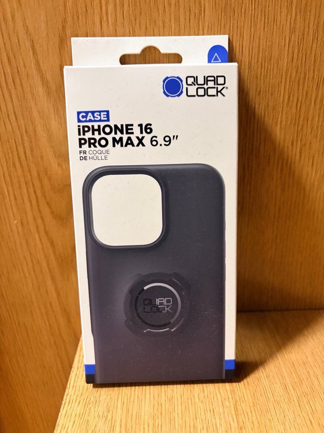 Custodia protettiva per iPhone 16 Pro Max da 6.9 pollici. Design in colore nero. Include sistema di montaggio Quad Lock.