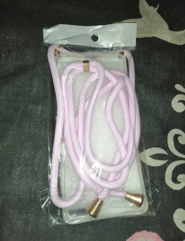 Custodia in silicone rosa chiaro con effetto marmo con cordino per appenderla.
