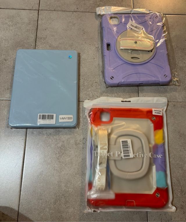 Dettagli del prodottoSet di tre fodere protettive per iPad Pro 11. - Fodera blu chiaro. - Fodera viola con supporto girevole. - Fodera multicolore con supporto e cinghia. La descrizione è stata tradotta automaticamente.