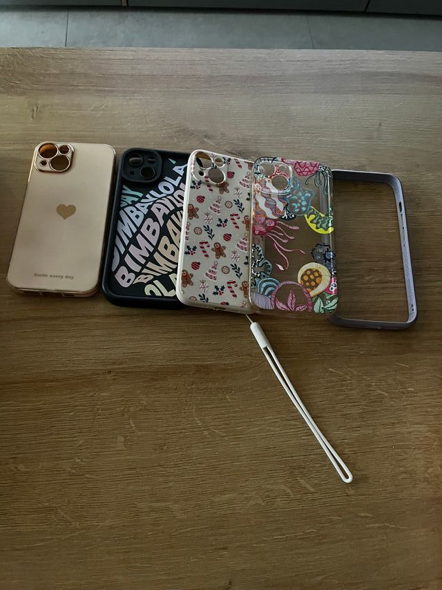 Dettagli del prodottoSet di cover per iPhone 13 con diversi design. - Cover dorata con cuore e testo. - Cover nera con testo BIMBA Y LOLA. - Cover bianca con design natalizio (zenzero, alberi). - Cover trasparente con design di meduse e frutta. - Bumper viola. La descrizione è stata tradotta automaticamente.