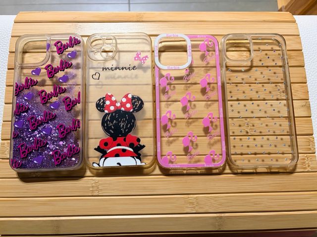 Dettagli del prodottoSet di cover per iPhone 14 Plus o Pro Max con design di Barbie e Minnie. - Cover trasparente con glitter e cuori viola. - Cover con Minnie Mouse e dettagli di coccinella. - Cover trasparente con sagome di Barbie e fenicotteri rosa. - Cover trasparente con piccoli punti luminosi. La descrizione è stata tradotta automaticamente.