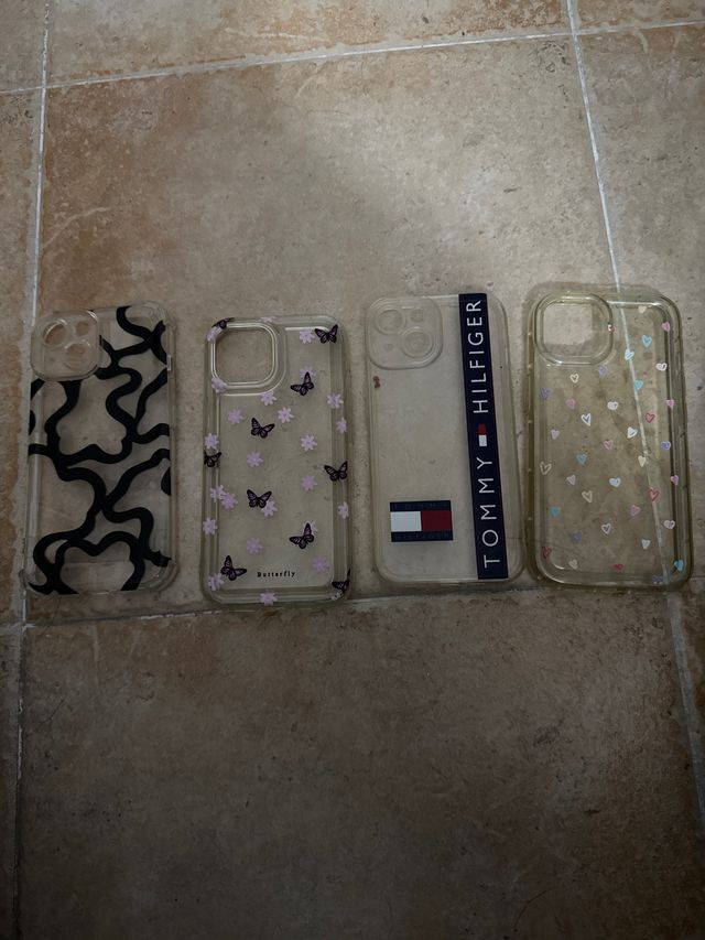 Dettagli del prodottoSet di quattro custodie trasparenti per iPhone 15 con diversi design.