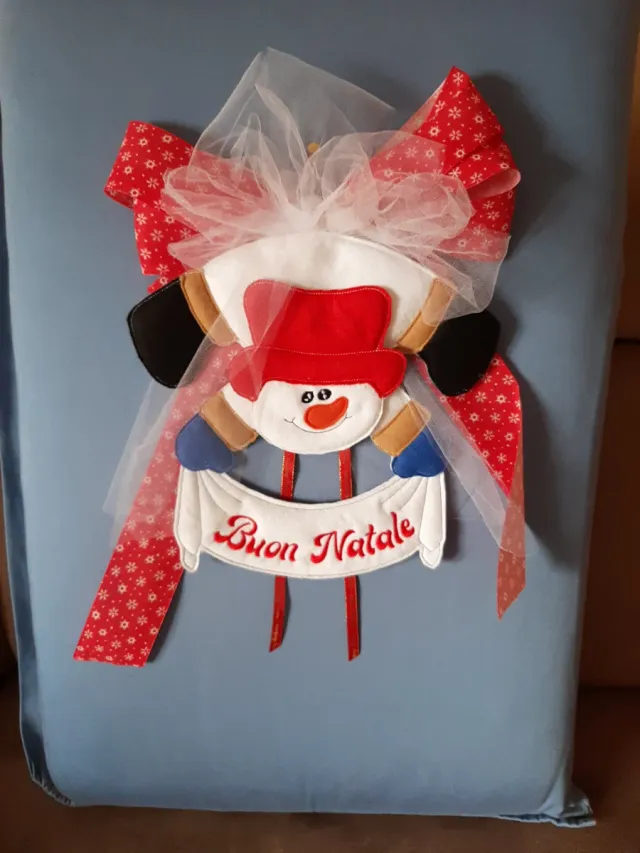 Dettagli del prodottoDecorazione natalizia a forma di pupazzo di neve, perfetta per appendere alla porta.