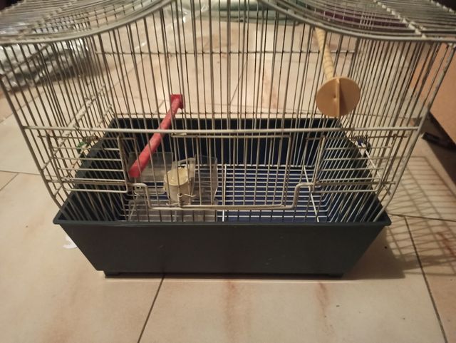Gabbietta per uccelli. in vernice bianca e plastica blu. la vernice presenta alcuni punti di usura