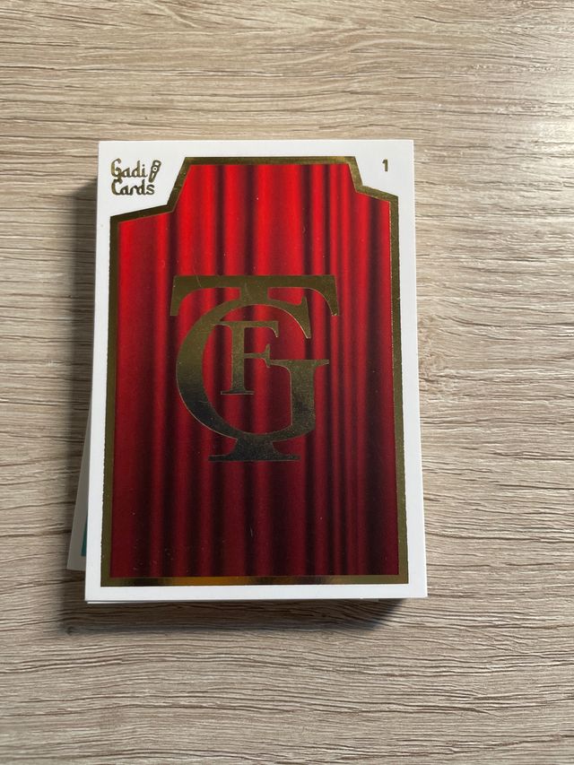 Biglietto Gadi Cards con design a tenda rossa e logo dorato. - Numero della carta: 1 - Design: tende rosse - Dettaglio: logo dorato