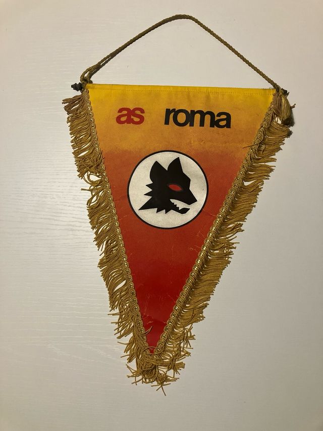 Gagliardetto ufficiale dell'AS Roma. - Design a triangolo con frange dorate. - Logo AS Roma con il lupo capitolino. - Colori giallorossi sfumati.