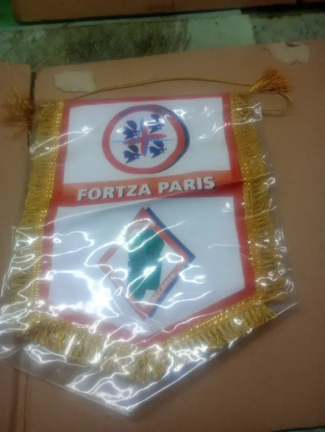 Gagliardetto con stemma e scritta FORZA PARIS. - Decorazione con frange dorate. - Logo circolare con figure stilizzate. - Stemma a forma di rombo con figura verde.