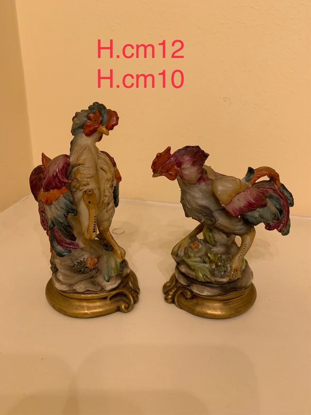 Coppia di galli in ceramica Capodimonte in posizione battagliera alti cm10 e cm12