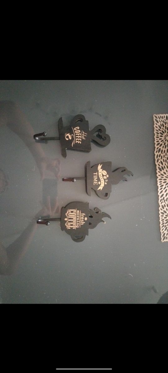 Ganci appendi strofinacci o mestoli o guanti da cucina. uno dei ganci presenta un segno di usura che si può coprire con un pennarello nero.