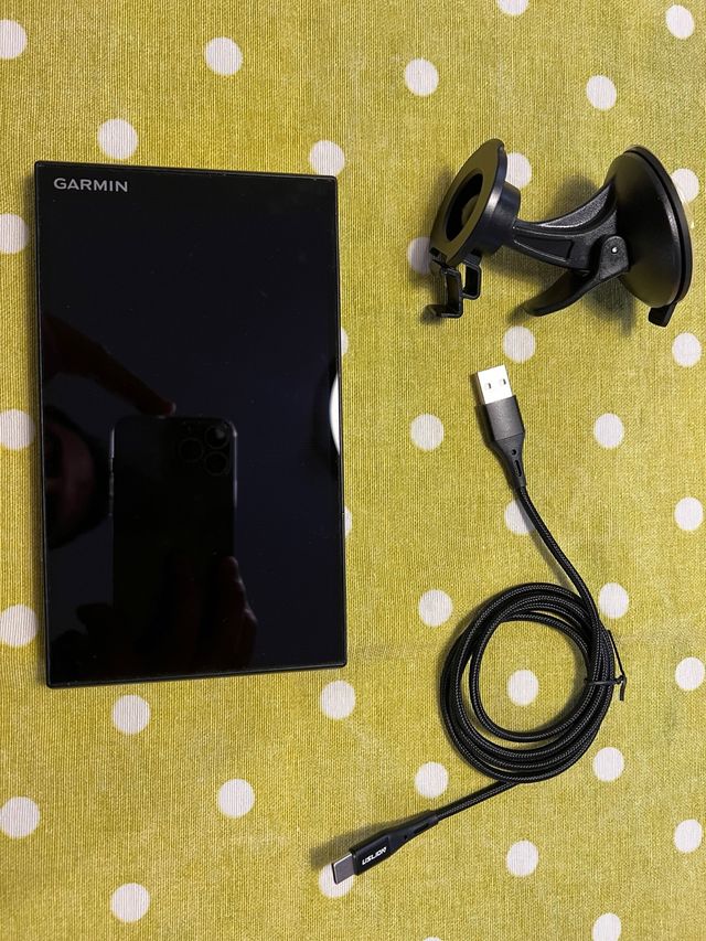 Navigatore Garmin completo di accessori. - Supporto con ventosa per auto. - Cavo di alimentazione/dati USB-C.