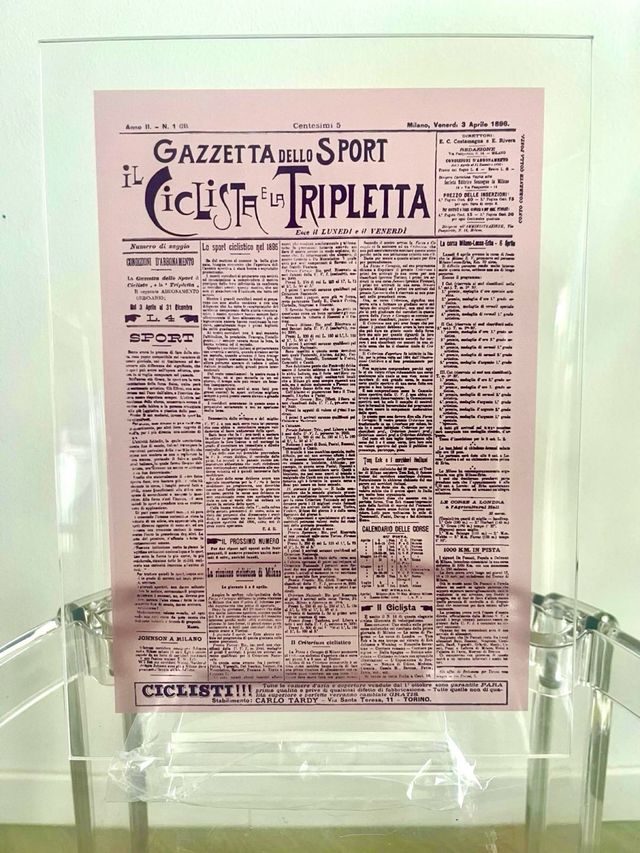 Dettagli del prodottoBellissima copia della prima pagina de La Gazzetta dello Sport del 3 aprile 1896, in cornice di plexiglas espositore con piedistallo - nuovo mai aperto. - Un pezzo unico per collezionisti. - Ideale per appassionati di ciclismo e storia dello sport.