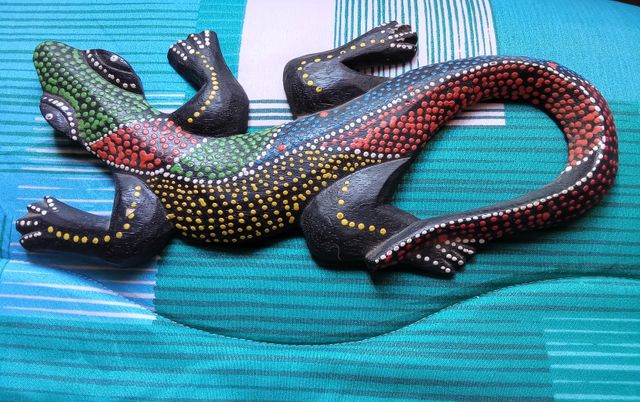 Geco decorativo in legno, dipinto a mano con colori vivaci. - Design a forma di geco. - Decorazioni a pois multicolore. - Realizzato in legno.