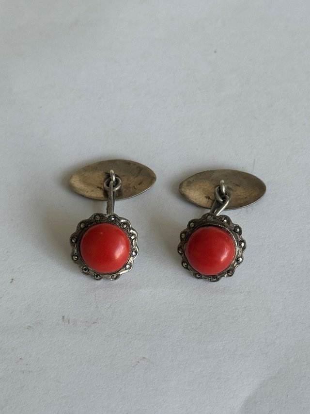 Eleganti gemelli realizzati in argento 800, impreziositi da spole di corallo rosso grandi 1 cm, e 12 diamantini per manichino, in tutto ne sono 24 diamanti