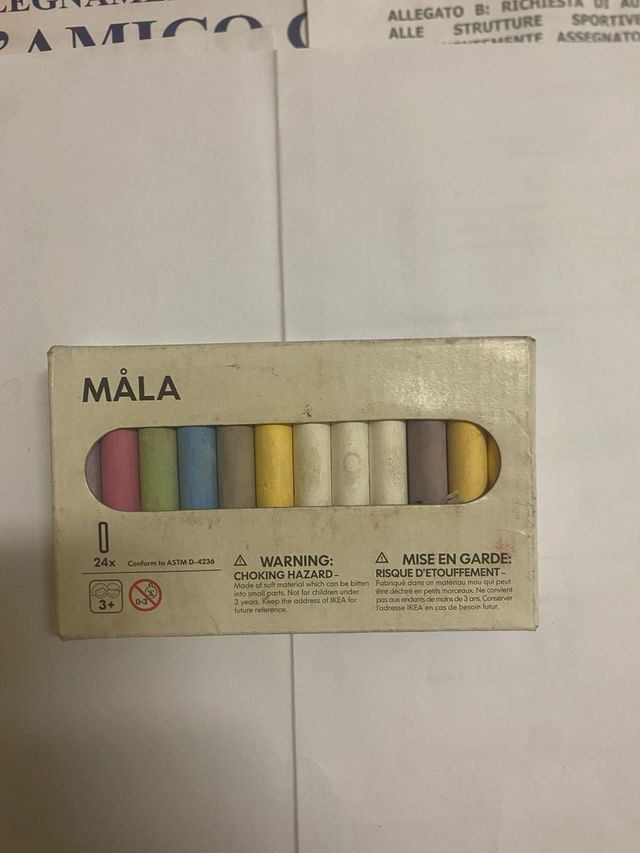Dettagli del prodottoConfezione di 24 gessetti colorati MALA di IKEA, conformi allo standard ASTM D-4236. Ideali per attività creative.