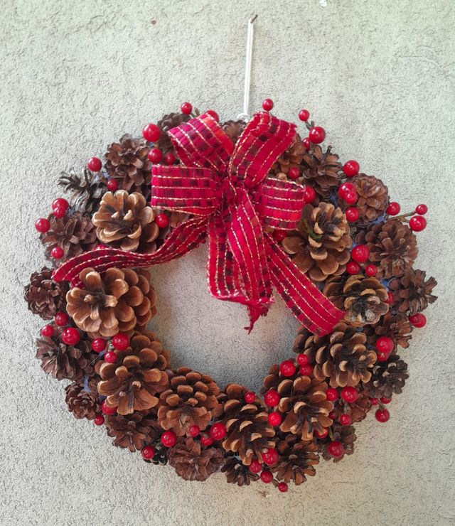 Dettagli del prodottoghirlanda natalizia fatta di pigne con bacche e fiocco rosso Misure del prodotto