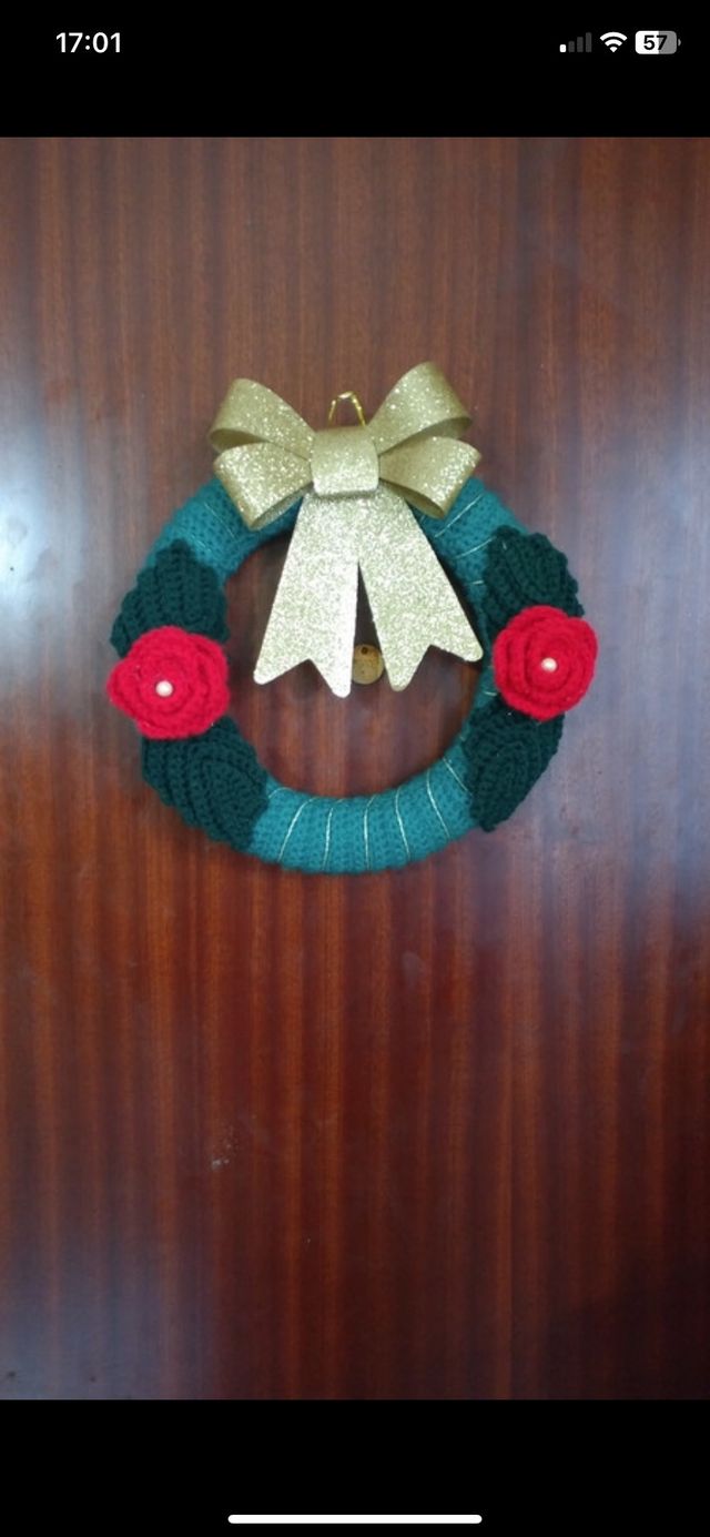 Realizzata completamente all’uncinetto con 2 rose e foglie un un bel fiocco dorato. Materiale acrilico misure 20cm. Idea regalo
