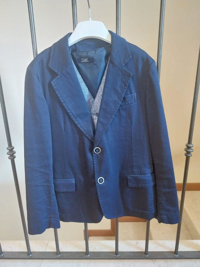 Giacca blu elegante bambino + crousette coordinato blu e bianco. Cotone al 98%. Taglia 36 circa 8-20 anni. Marca QDK. Usato una volta sola, praticamente nuovo. Ottime rifiniture, prodotto italiano