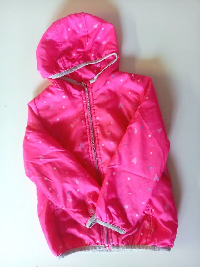 Dettagli del prodottoGiacca a vento bambina, rosa pois e cuori. Cerniera argento con cursore a cuore e brillantino. Rifinitura cappuccio e maniche argentato. Blukids. Taglia 104 cm, 3-4 anni. Misure del prodotto